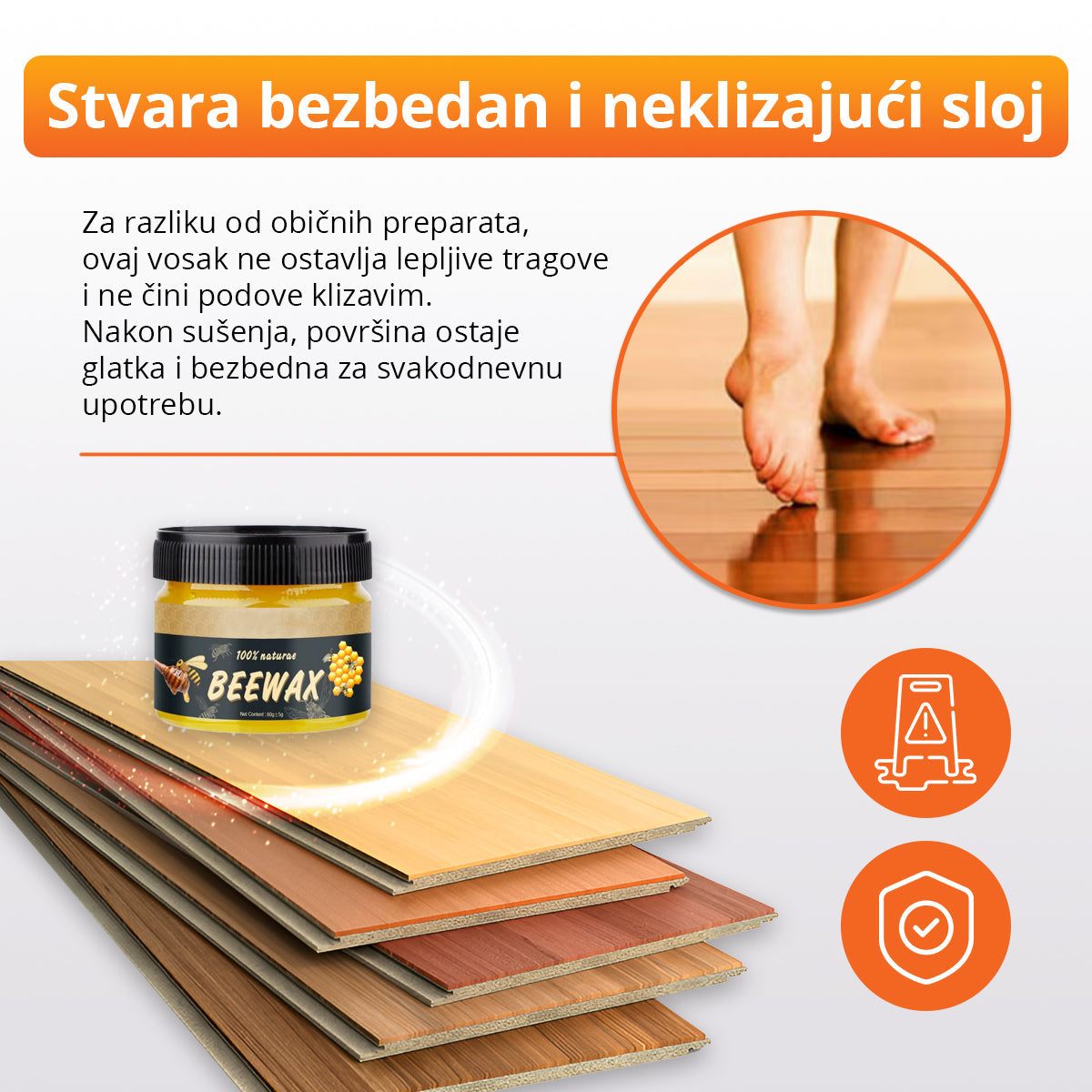 Za razliku od običnih preparata, ovaj vosak ne ostavlja lepljive tragove i ne čini podove klizavim. Nakon sušenja, površina ostaje glatka i bezbedna za svakodnevnu upotrebu.